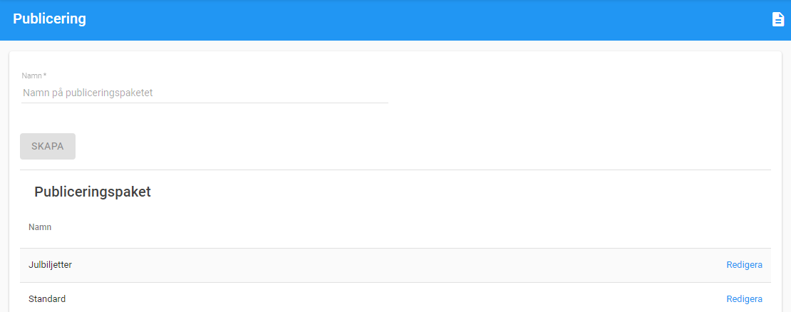Nya publiceringspaket skapas under Artiklar>Övrigt>Publicering. Skriv ett namn på ditt nya publiceringspaket och tryck på Skapa.