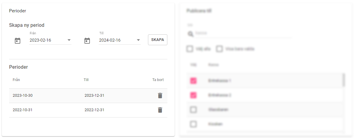 Här anger man när publiceringspaketet ska vara giltigt. När publiceringspaketet har utgått kommer knapparna ligga kvar i befintlig kassalayout, men de blir grå och går inte att välja till försäljning. Det är möjligt att välja flera tidsintervall för att ställa in varierad giltighet under flera år framöver.
