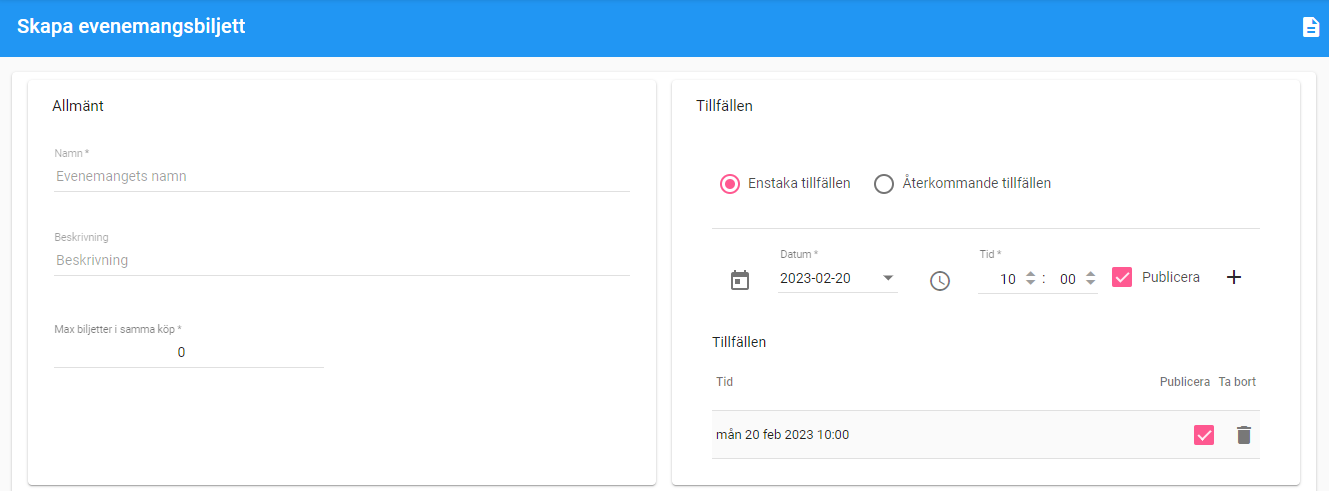 För att skapa en ny evenemangsbiljett klickar man på knappen Skapa evenemangsbiljett. Först anger man evenemangets namn, och om man önskar, en kort beskrivning till denna (beskrivningen syns endast i kassan och på denna sida).