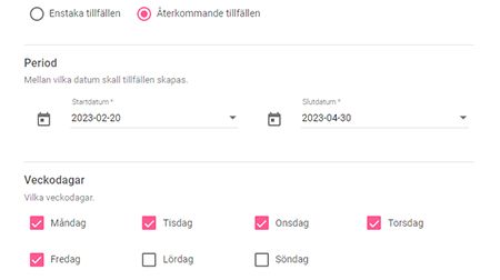 Veckodagar: Kryssa i vilka veckodagar under vald period som tillfällena ska inträffa.