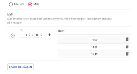 Mall: Välj detta alternativ om tillfällena inte har en specifik intervall utan sporadiska tider, t ex 08:00, 09:15, 11:40.