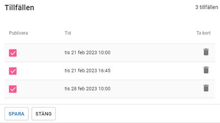 När du har justerat tillfällen antingen enligt mall eller intervall, tryck då på knappen Skapa tillfällen för att skapa upp tillfällena enligt den mall du nu har satt. Då visas en lista med alla tillfällen som skapats. Här har man möjlighet att direkt ta bort ett tillfälle genom att trycka på papperskorgen. Bra om man har ett fåtal tillfällen som inte följer mallen i den valda datumperioden, som man kan exkludera direkt.
