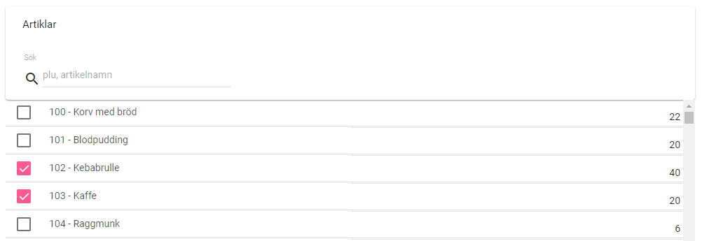Justera sedan artiklarnas pris längst ut till höger i listan. Varje artikel behöver ha ett pris och det sammanlagda priset för dessa blir priset för prispaketet.