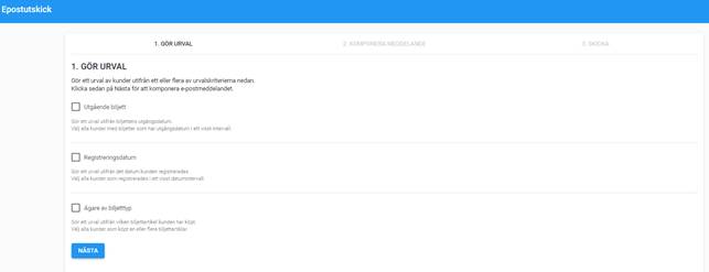 På sidan Kunder>Epostutskick kan man skicka enkla epostmeddelande till utvalda kunder. Urval kan göras på utgående biljett, registreringsdatum eller ägare av biljettyp. Meddelandet som skickas kan enbart innehålla text och man behöver ha en e-postserver kopplad till kassasystemet. Kontakta supporten om ni är osäkra på om mailserver är konfigurerad.