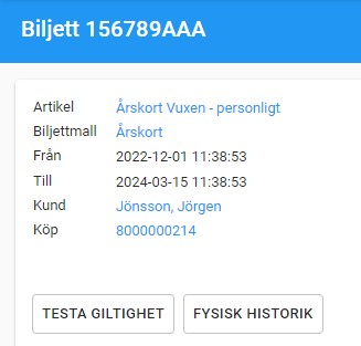 Med knappen Testa giltighet kan man kontrollera biljettens giltighet i en specifik biljettläsare vid en specifik tidpunkt.