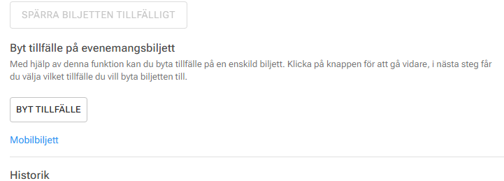 Om biljetten är kopplad till evenemangsbiljetter där det finns fler tillfällen kan man flytta biljetten till ett annat tillfälle med knappen Byt tillfälle.