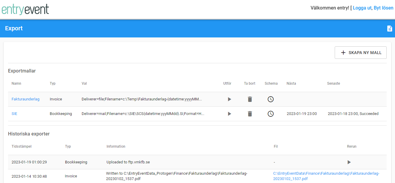 Under Admin>Data>Export listas de exporter som är konfigurerade i systemet, t ex bokföringsexport till ert bokföringsprogram eller fakturaexport. Exporter kan schemaläggas (om en export är schemalagd visas ett datum i kolumnen Nästa) eller köras när man önskar genom knappen Utför.