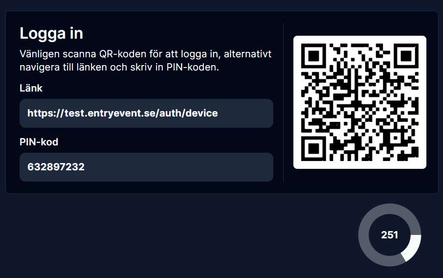 Nedräkningen nere i högra hörnet visar hur många sekunder du har på dig att slutföra inloggningen - PIN-koden är endast giltig i 5 minuter. När 5 minuter har gått kommer sidan generera en ny PIN-kod som är giltig de kommande 5 minuterna.
