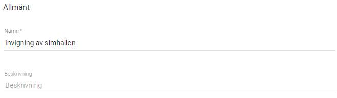 Välj ett beskrivande namn på ditt evenemang som är logiskt, både för kassapersonal och besökare. Namnet kommer att vara rubriken för biljetten när den säljs i webbshopen, så det är en fördel om det är tydligt. Det är även vanligt att namnet skrivs ut på eventuell webbiljett. Här har vi en tillställning som heter ”Invigning av simhallen”.