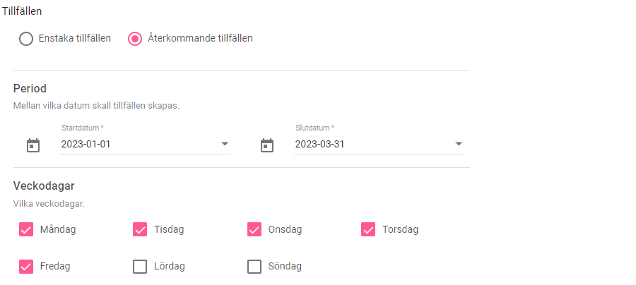 Nu ska du bestämma när ditt evenemang ska inträffa. Antingen om det är enstaka tillfällen, så kan man snabbt lägga upp ett eller två olika datum. Om man har fler tillfällen är Återkommande tillfällen det bättre valet. Här väljer man först mellan vilka datum dessa tillfällen ska skapas upp (kan vara allt från 1 dag till ett helt år!). Välj vilken veckodag evenemanget inträffar på och kryssa i rätt dagar.