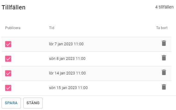Ett evenemang kan ha ett eller flera tillfällen, dvs en engångsföreteelse eller återkommande tillfällen över en längre period. Man kan skapa flera tillfällen per dag, men två tillfällen på samma evenemang kan aldrig ha samma tid.