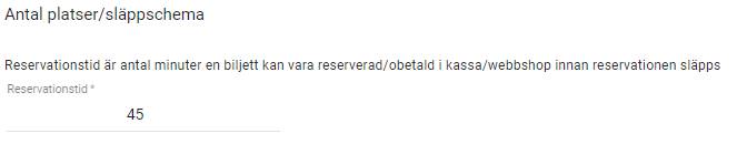 Nu är det dags att konfigurera släppschemat. Det första man behöver bestämma är reservationstiden – antal minuter som man max får reservera en evenemangsbiljett innan den behöver betalas. Om man inte betalar innan tiden gått ut släpps reservationen och biljetterna blir tillgängliga för andra kunder. I både webbshop och kassa får man besked om hur lång tid det är kvar innan reservationen släpps.