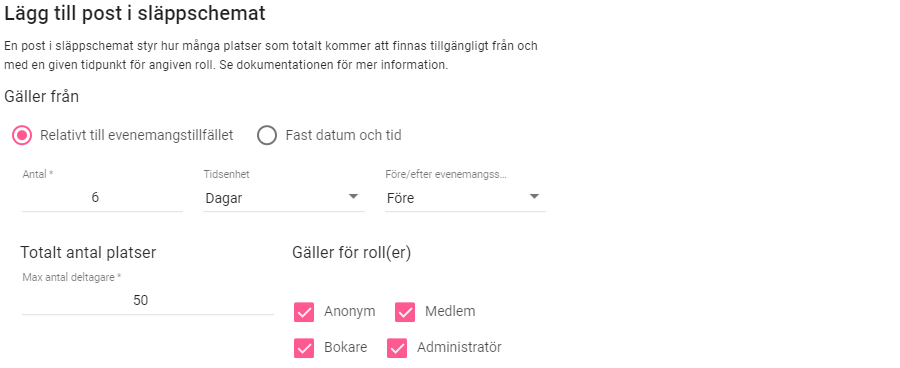 Totalt antal platser: Här bestämmer man alltså hur många biljetter som totalt ska finnas tillgängliga vid varje tidpunkt. Notera ordet ”totalt” som alltså betyder hur många platser det finns totalt per tillfälle. En ny rad i släppschemat med 10 platser kommer alltså inte att addera 10 platser, utan skulle här justera ned antalet platser till 10.