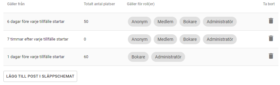 Släppschemat bestämmer hur många platser som ska finnas per tillfälle och när biljetterna ska bli tillgängliga för försäljning i kassa och webbshop. Du skapar ditt släppschema genom att lägga till poster (rader) som bestämmer totalt hur många biljetter som ska vara tillgängliga för en viss roll vid en viss tidpunkt.