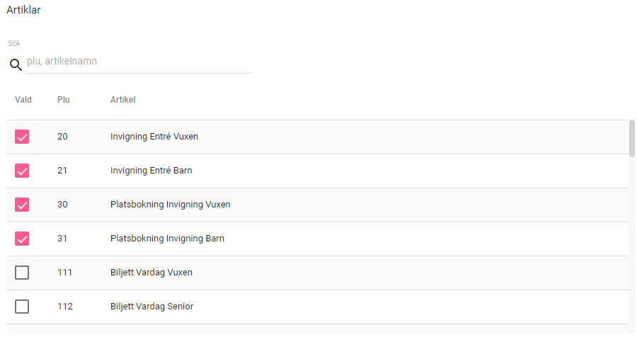 Nu ska vi koppla våra biljetter till evenemanget. Man kan koppla ett flertal biljetter här baserat på hur många olika biljettyper man vill sälja. Här har vi kopplat våra invignings-biljetter för barn och vuxen, eftersom det är olika pris baserat på ålder. Antingen använder man sina vanliga entrébiljetter, eller så skapar man specifika biljetter till evenemanget, så att man kan få fram statistik på exakt hur många biljetter som har sålts till just detta evenemang.